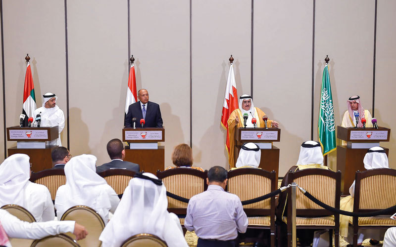 قال بيان لوزراء خارجية الدول الداعية لمكافحة الإرهاب، الإمارات والسعودية والبحرين ومصر، عقب اجتماعهم في العاصمة البحرينية المنامة، إن موقف الدول الأربع موحد وثابت، ويأتي انطلاقاً من حرصها على الأمن القومي العربي، وجدد البيان مطالبتها لقطر بتنفيذ المطالب الـ13، وأعلن الاستعداد للحوار مع قطر «عندما تتوقف عن دعم الإرهاب»، فيما قال سمو الشيخ عبدالله بن زايد آل نهيان، وزير الخارجية والتعاون الدولي «حريصون على المواطن القطري في كل الخطوات التي نتخذها في أزمة قطر»، وأضاف: «نحرص على إنهاء الأزمة القطرية في أسرع وقت ممكن»، وأكد سموه أن «الدوحة مسؤولة عن أي أضرار تعرض لها المواطن القطري بسبب الأزمة».