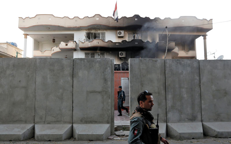 رجل أمن أفغاني أمام مقر السفارة العراقية عقب الهجوم. رويترز