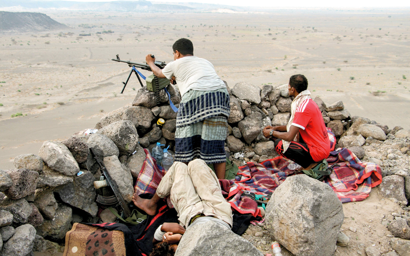 عنصران من قوات الشرعية خلال مواجهات مع الميليشيات في تعز. أ.ف.ب