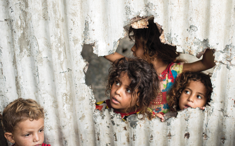 أطفال ينظرون من فتحة في جدار معدني خارج بيتهم في غزة. رويترز