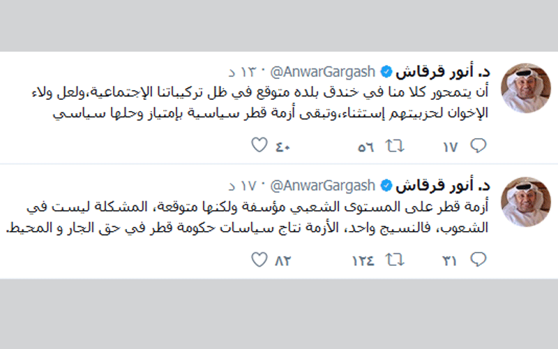 قال وزير الدولة للشؤون الخارجية الدكتور أنور قرقاش، في تغريدة له عبر حسابه في موقع التواصل الاجتماعي "تويتر": أزمة قطر على المستوى الشعبي مؤسفة ولكنها متوقعة، المشكلة ليست في الشعوب، فالنسيج واحد، الأزمة نتاج سياسات حكومة قطر في حق الجار و المحيط.