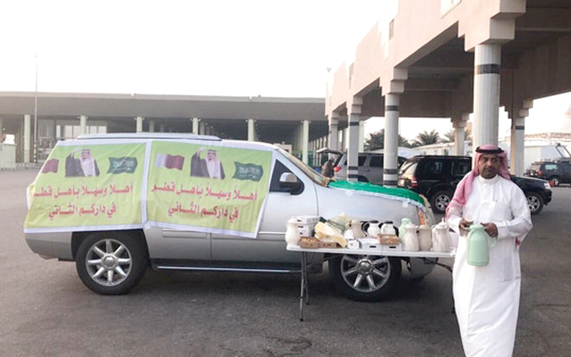 القحطاني جهز سيارة محملة بالمشروبات والأكلات الشعبية والتمر لاستقبال حجاج قطر. من المصدر