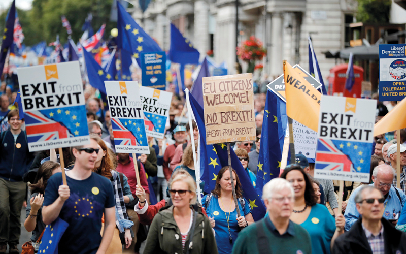 تظاهر عشرات الآلاف من البريطانيين في العاصمة لندن، أمس، احتجاجاً على خروج بلادهم من الاتحاد الأوروبي.