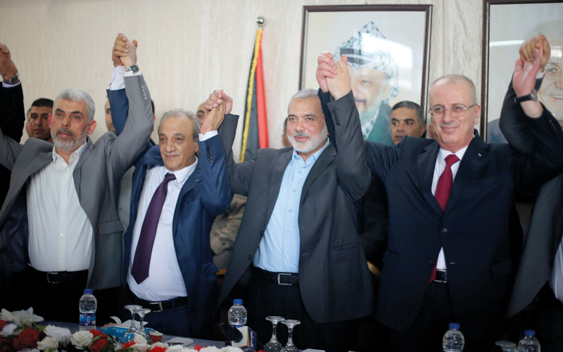 الحمدالله وهنية لدى استلام الحكومة الفلسطينية مهامها في القطاع. رويترز