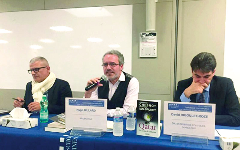 وتوقف المشاركون بالتفصيل عند محور متخصص بدعم قطر للإرهاب بعنوان: «قطر وتهديد العالم بدعم الإرهاب»، وقدم المناقشة الصحافي الإيراني المعارض أفشين ألافي، بمداخلة المدير السابق لوحدة مراقبة الحدود بالداخلية الفرنسية إيف بونيه، ورئيس المنظمة الفرنسية لحقوق الإنسان جون ماهر.