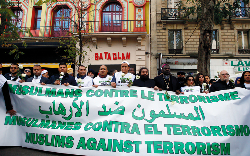 مجموعة «مسلمون ضد الإرهاب» وناشطون خلال وقفة تضامنية أمام مسرح باتاكلان في ذكرى هجمات باريس. أ.ب