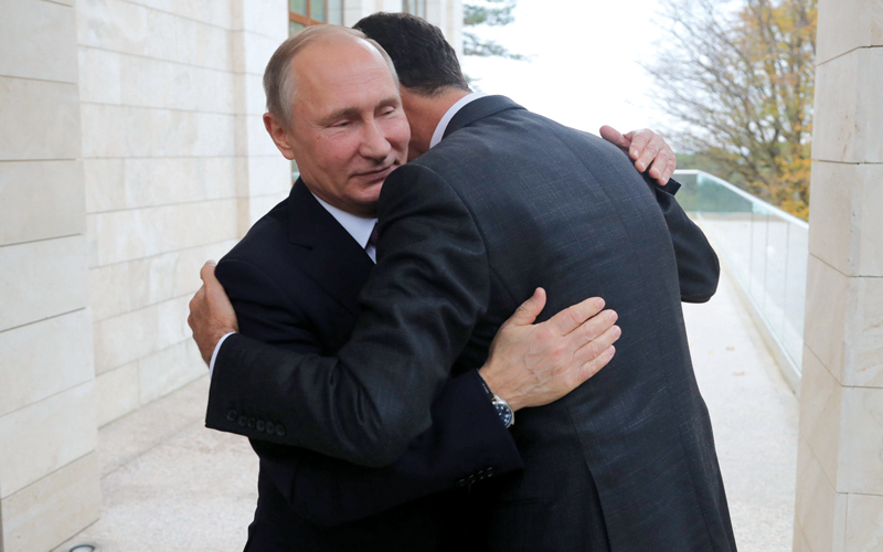 عناق بين بوتين والأسد بعد زيارة خاطفة من الأخير إلى روسيا. أ.ف.ب