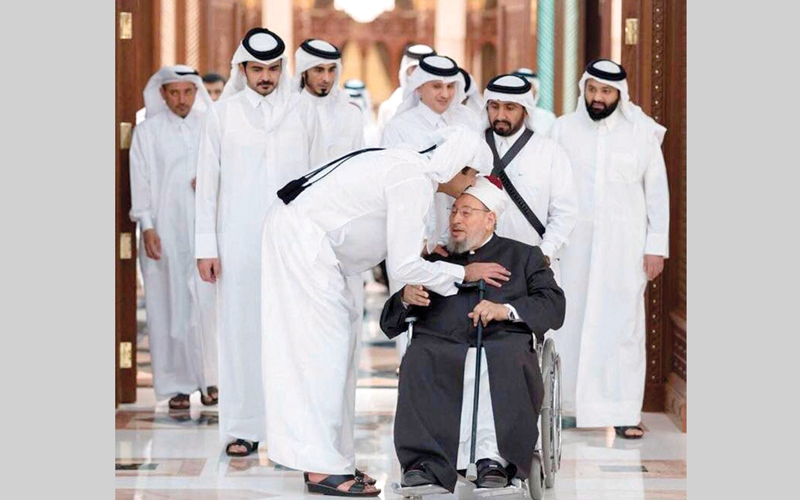 أمير قطر تميم بن حمد يقبّل رأس القرضاوي. أرشيفية