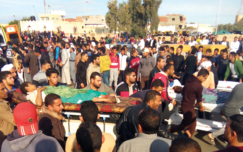 أعلنت النيابة العامة المصرية، أمس، أن عدد ضحايا الهجوم الدامي، الذي وقع على مسجد قرية الروضة بمنطقة بئر العبد بمحافظة شمال سيناء ارتفع إلى 305 شهداء من بينهم 27 طفلاً، و128 مصاباً، مشيرة إلى أن الإرهابيين كانوا يرفعون علم تنظيم «داعش» وأن عددهم يراوح بين 25 و30 شخصاً.