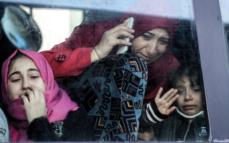 فلسطينية وطفلها تطلان من نافذة حافلة في طريقها من خانيونس إلى معبر رفح. أ.ف.ب