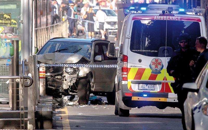 قاد أسترالي، له أصول أفغانية وتاريخ من المشكلات النفسية، سيارته ليدهس متسوقين لعيد الميلاد في مدينة ملبورن الأسترالية، أمس، ما أدى إلى إصابة 19 شخصاً، لكن الشرطة قالت إنها لا تعتقد أن الهجوم مرتبط بالإرهاب.