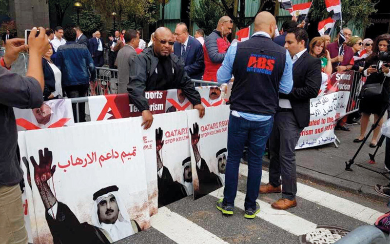 تظاهرات ضد تميم خلال كلمته في الأمم المتحدة حيث ندد المتظاهرون بدعم قطر للإرهاب. أرشيفية