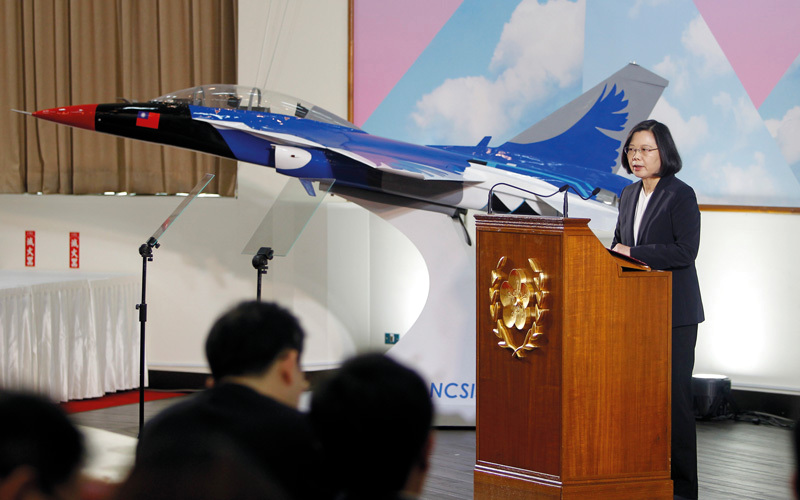 تساي إينغ في مؤتمر صحافي على منصة وضع حولها نموذجان لطائرتين مقاتلتين. أ.ب
