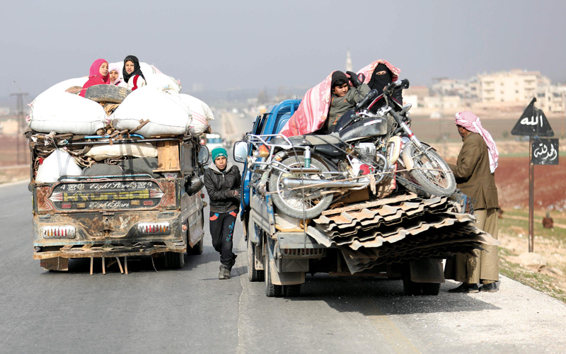 نازحون من ريف إدلب الجنوبي على الطريق السريع بين دمشق وحلب يتجهون نحو المناطق الخاضعة للمعارضة. أ.ف.ب