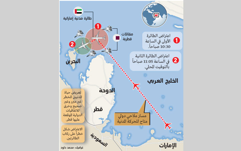 اعترضت مقاتلات قطرية، أمس، طائرتين مدنيتين إماراتيتين، خلال رحلتين اعتياديتين إلى المنامة، في تهديد سافر وخطر لسلامة الطيران المدني، فيما شددت الإمارات على رفضها لتهديد سلامة الطيران المدني، أكدت أنها ستتخذ جميع الإجراءات القانونية اللازمة، لضمان أمن وسلامة حركة الطيران المدني.