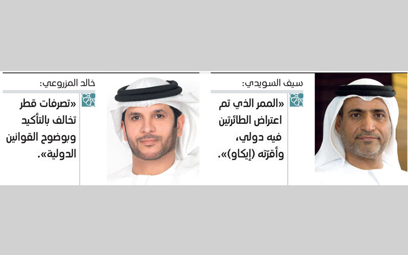 وبيّن أن تصرفات قطر غير المبالية بالاتفاقيات والأعراف الدولية، تخالف بالتأكيد وبوضوح القوانين الدولية الموقع عليها من قبلها، وتعرض دون شك الملاحة الجوية للخطر، لافتاً إلى أن عملية الاعتراض تدل على قلة الوعي والمعرفة لما يمكن أن يحدث للحركة الجوية، ناهيك عن أن هذه الأجواء تستخدمها مختلف شركات الطيران الدولية.