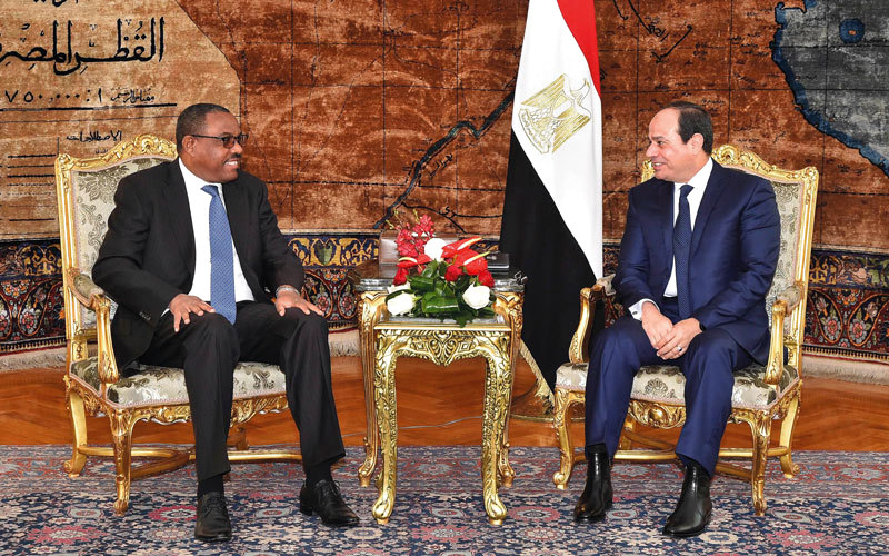 وأوضح الجانبان، في مؤتمر صحافي مشترك عقب محادثات بينهما في القاهرة، أنهما بحثا تطورات سد النهضة، وإقامة منطقة صناعية مصرية في إثيوبيا. وقال السيسي إنه عبّر خلال اللقاء عن «القلق البالغ من حالة الجمود في الجانب الفني بملف السد» الذي تبنيه إثيوبيا وتتخوف مصر من أن يؤثر في حصتها من المياه.