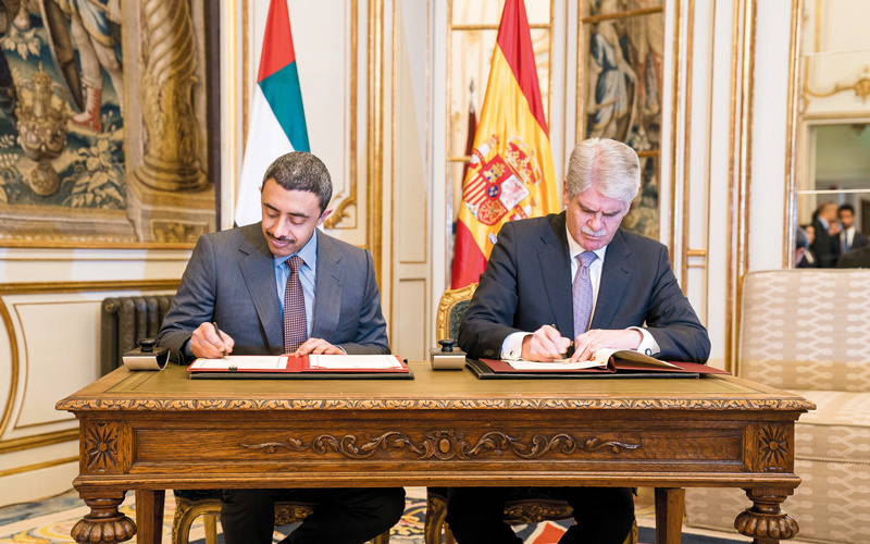 عبدالله بن زايد وداستيس خلال التوقيع على مذكرة تفاهم تتعلق بالتعاون بين المدرسة الدبلوماسية الإسبانية والأكاديمية الدبلوماسية في الإمارات. وام