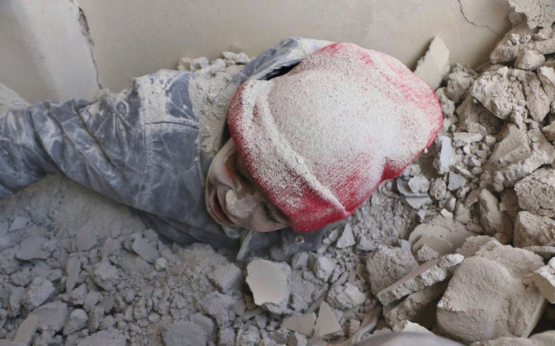 طفل تحت أنقاض منزل تهدّم بقصف لقوات النظام على الغوطة الشرقية لدمشق. أ.ب