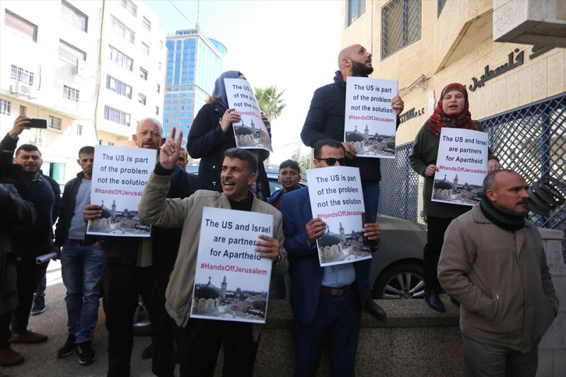 رشق شبان فلسطينيون وفدا أميركيا يضم أعضاء في المجلس البلدي لنيويورك يزور الضفة الغربية المحتلة بالبيض، وسط غضب بشأن قرار الرئيس الأميركي دونالد ترامب الاعتراف بالقدس عاصمة لاسرائيل.