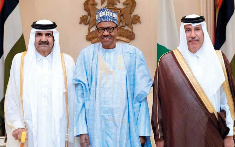 الرئيس النيجيري محمد بوخاري يتوسط «الحمدين». من المصدر
