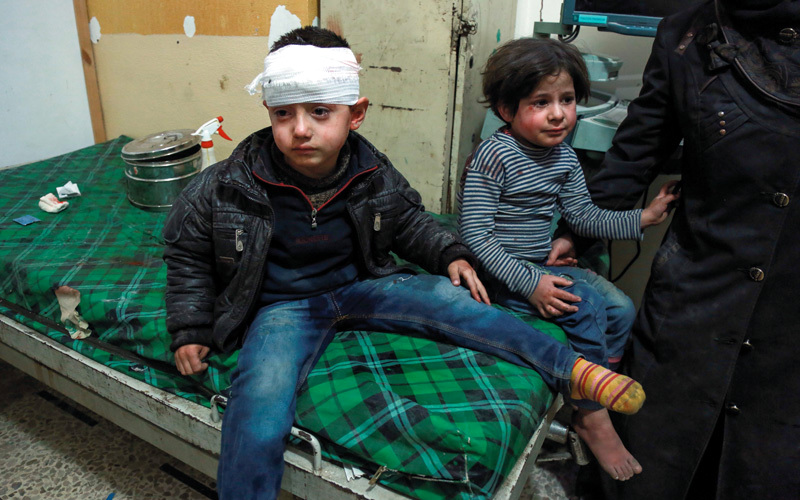طفلان يتلقيان العلاج في مستشفى مؤقت بعد إصابتهما بقصف لقوات النظام على مدينة دوما بالغوطة الشرقية. أ.ف.ب