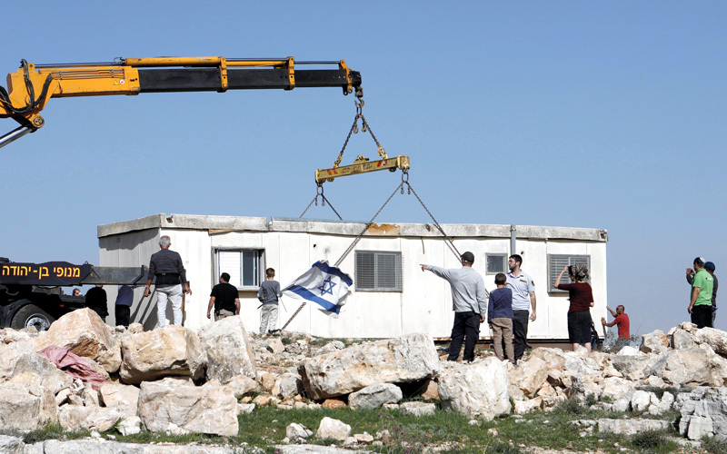 مستوطنون يثبتون بيوتاً استيطانية جاهزة قرب الخليل. إي.بي.إيه
