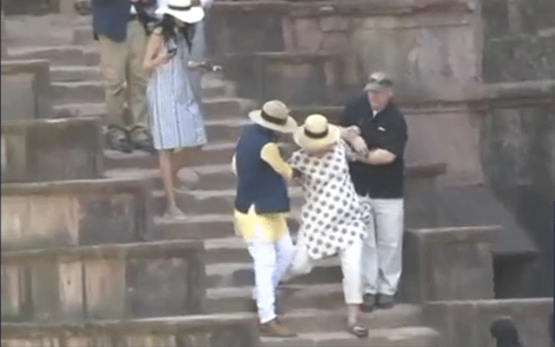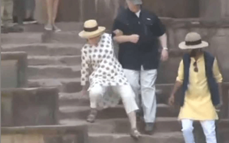 تعرَّضت وزيرة الخارجية الأميركية السابقة، هيلاري كلينتون، لموقف محرج خلال زيارتها للهند، إذ انزلقت قدمها مرتين أثناء نزولها سلم قصر جاهاج ماها.