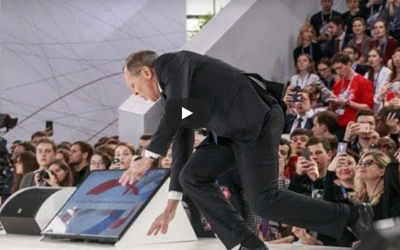 بالفيديو.. وزير خارجية روسيا يسقط أرضاً ويمازح الجمهور