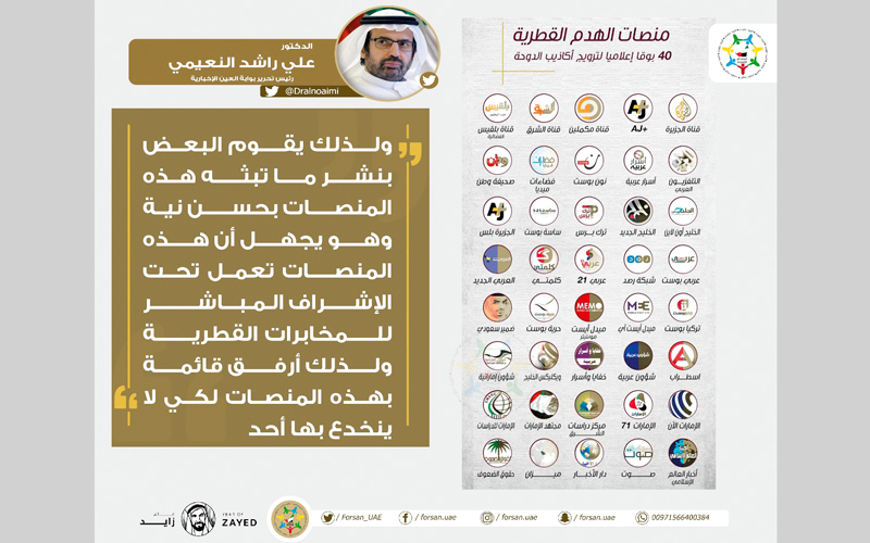 من جهة أخرى، نشر رئيس تحرير «بوابة العين الإخبارية»، الدكتور علي النعيمي، قائمة تحوي 40 منصة إخبارية، محذراً من التعامل معها كونها منصات هدم قطرية تعمل تحت الإشراف المباشر للمخابرات القطرية، وتهدف إلى زرع الفتنة والشقاق في المنطقة العربية عموماً ودول الخليج خصوصاً.