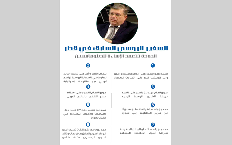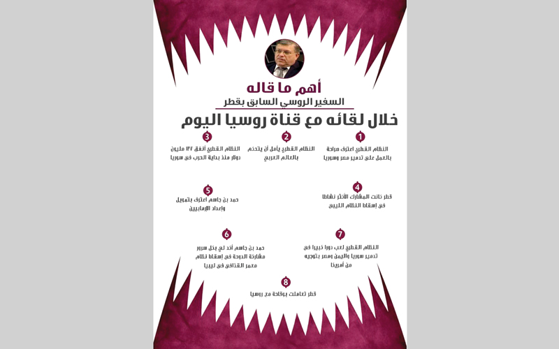 وأوضح الدبلوماسي الروسي أن وسائل الإعلام القطرية، ومعظمها تابع للحكومة، تطاولت على روسيا ووصفتها بألفاظ مهينة، لأنها لم توافق على السياسة القطرية.