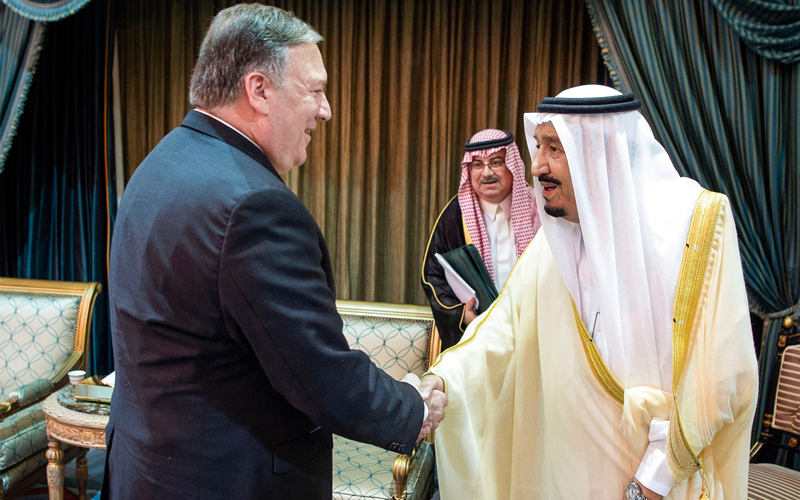 وذكرت وكالة الأنباء السعودية الرسمية (واس) أن الملك سلمان استعرض مع بومبيو العلاقات الثنائية بين البلدين الصديقين، وبحث مستجدات الأوضاع في منطقة الشرق الأوسط، والجهود المبذولة تجاهها.