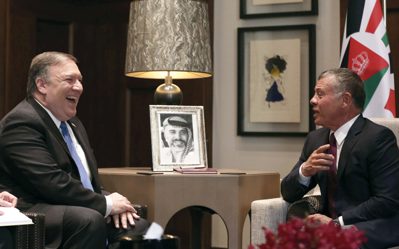 وبحث بومبيو أوضاع المنطقة مع نظيره الأردني، أيمن الصفدي، أمس، قبل لقائه العاهل الأردني، الملك عبدالله الثاني، بعدما كان زار السعودية وإسرائيل، أول من أمس.