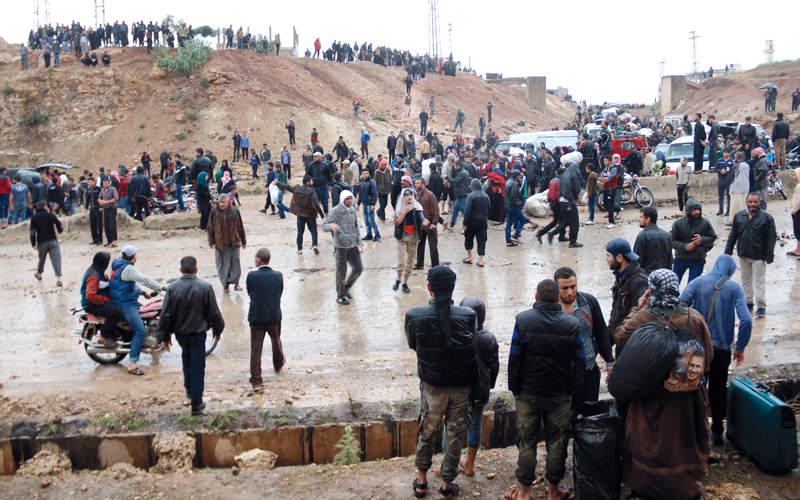 معارضون وعائلاتهم ينتظرون حافلات لإجلائهم من مدينة الرستن بريف حمص إلى ريف حلب. أ.ف.ب