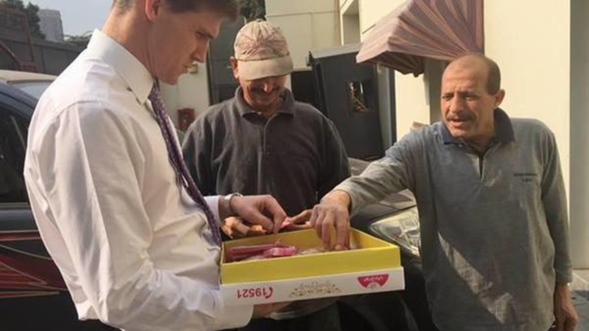 السفير البريطاني بالقاهرة يوزع التمر على الصائمين في الشوارع