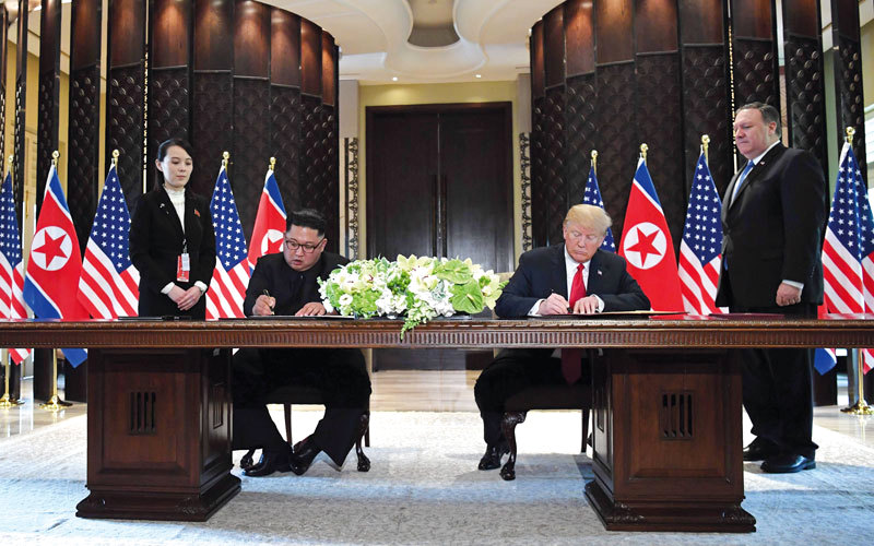 أشاد الرئيس الأميركي دونالد ترامب، والزعيم الكوري الشمالي كيم جونغ أون، بقمتهما التاريخية التي عقدت أمس في سنغافورة، باعتبارها اختراقاً في العلاقات بين البلدين، وقوبلت القمة التي بدأت بمصافحة تاريخية بين ترامب وكيم، واختتمت بتوقيع وثيقة مهمة وشاملة، بترحيب من روسيا والصين والاتحاد الأوروبي، رغم أن الاتفاق الذي توصلا إليه لم يعطِ الكثير من التفاصيل حول المسألة الأساسية المتعلقة بترسانة بيونغ يانغ النووية.