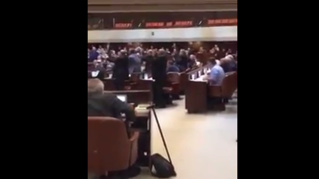 بعدها طلب رئيس الكنيست من أفراد الأمن، إخراج النواب العرب، الذين يشكلون تحالفا من 4 أحزاب داخل الكنيست، بإخراجهم من القاعة، وشوهد أحد رجال الأمن وهو يسحب النائب جمال زحالقة من مقعده ويدفعه خارج القاعة.