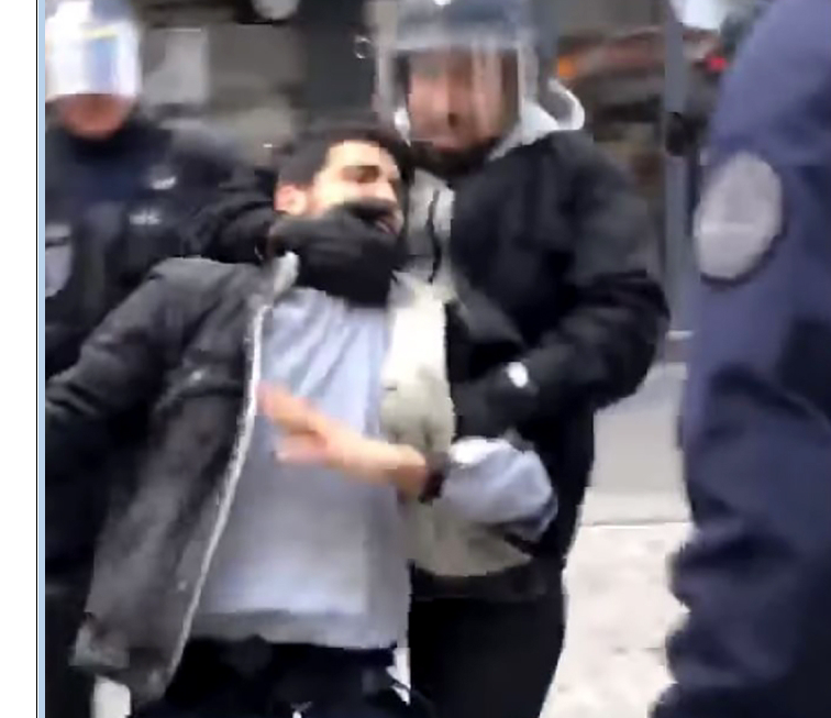 وفي مقطع الفيديو يظهر رجل يرتدي خوذة وشعار تعريف الشرطة وهو يجر امرأة بعيدا ثم يضرب متظاهرا يوم الأول من مايو. وجرى التعرف عليه في وقت لاحق بأنه أحد موظفي الرئاسة الفرنسية.