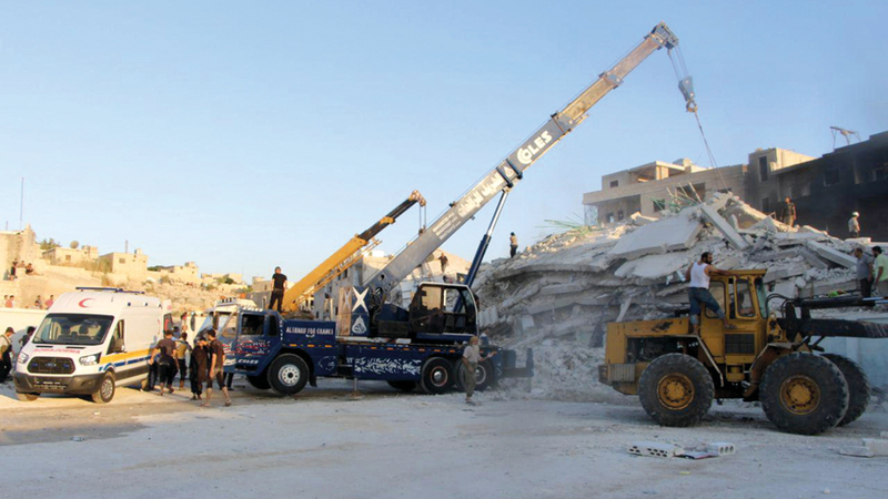 جرافة تعمل على رفع الركام من مكان الانفجار فيما ينهمك عناصر «الخوذ البيضاء» في البحث عن القتلى. أ.ب