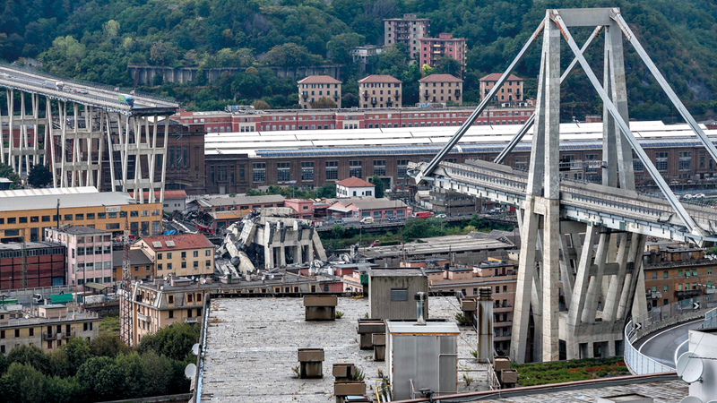 • انهيار قسم كبير من الجسر فوق خط للسكك الحديدية جاء بينما كان الجسر يخضع لأعمال صيانة، وفيما كانت منطقة ليغوريا، حيث تقع جنوى، تشهد أمطاراً غزيرة.