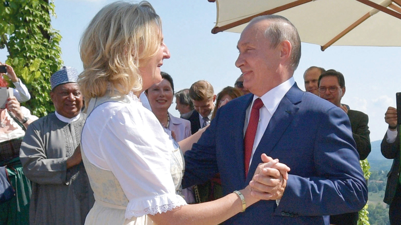 رقص الرئيس الروسي، فلاديمير بوتين، مع وزيرة خارجية النمسا، كارين كنايسل، في حفل زفافها الذي حضره، أول من أمس، تلبية لدعوة قال منتقدوها إنها تضعف موقف الغرب ضد موسكو.