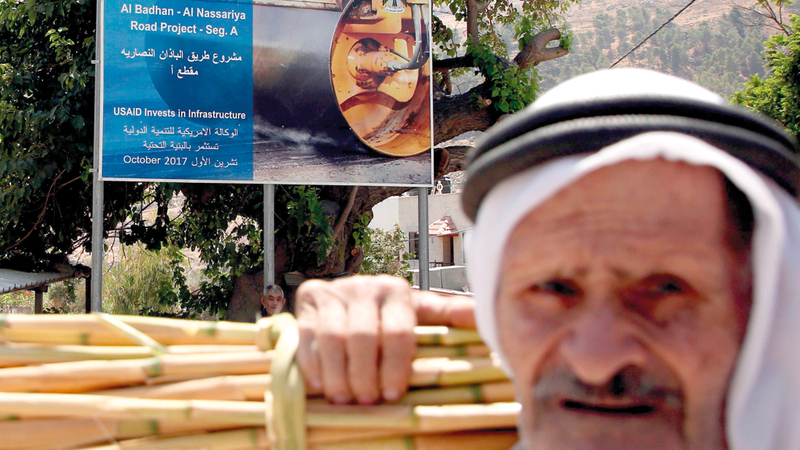 فلسطيني يمرّ أمام لافتة في قرية شمال نابلس تحمل إعلاناً عن مشروع بتمويل أميركي غداة إعلان واشنطن تقليص مساعداتها. أ.ف.ب