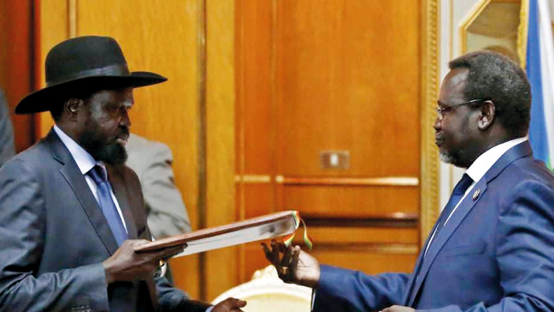 ووقع الزعيمان على اتفاقات عدة، بينها اتفاق وقف دائم لإطلاق النار، وآخر لتقاسم السلطة ينص على عودة مشار إلى منصبه كنائب أول للرئيس، إلا أن زعيم المتمردين رفض أمس، التوقيع على الوثيقة النهائية.