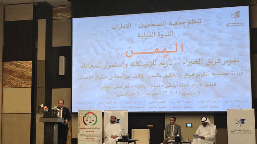 أكد خبراء دوليون مشاركون في ندوة دولية نظمتها جمعية الصحفيين في أبوظبي تحت عنوان "تقرير فريق الخبراء.. تأزيم للانتهاكات واستمرار للمعاناة"، أن تقرير فريق التحقيق المكلف من قبل مجلس حقوق الإنسان، التابع للأمم المتحدة، بدراسة حالة حقوق الإنسان باليمن يفتقد لأدنى معايير الحياد والموضوعية.