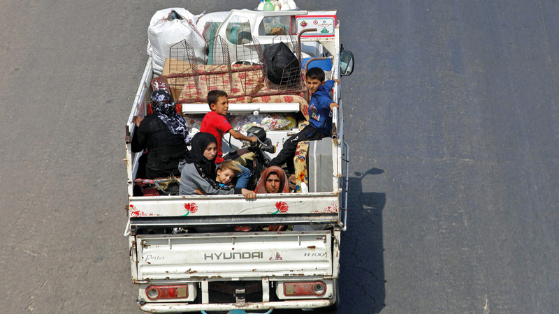 أسرة من سكان محافظة إدلب تفر باتجاه الحدود التركية السورية. أ.ف.ب