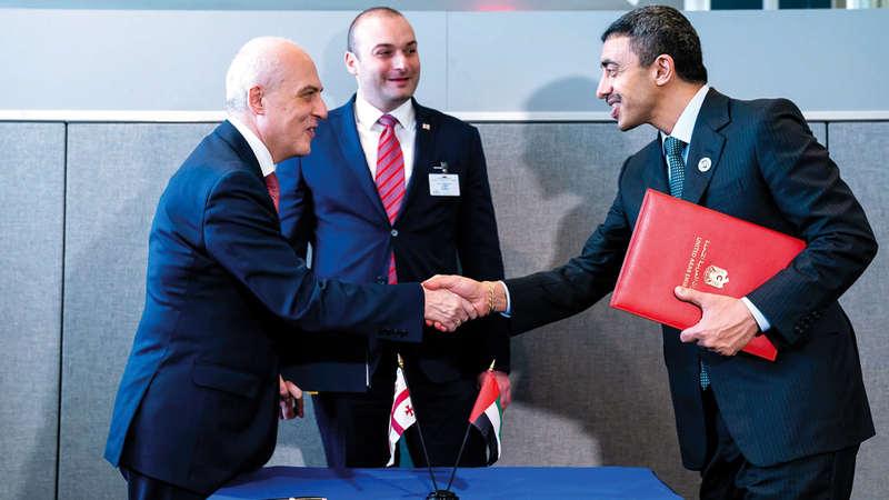 عبدالله بن زايد خلال التوقيع على مذكرة التفاهم مع نظيره الجورجي. وام