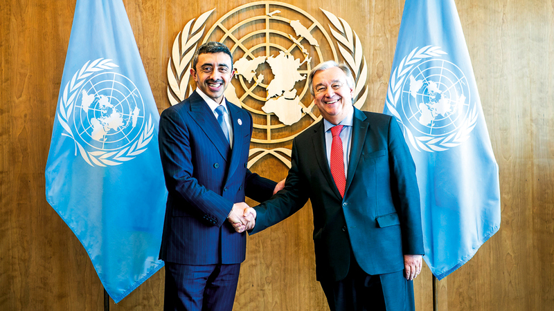 أمين عام الأمم المتحدة يستقبل عبدالله بن زايد ويشيد بدور الإمارات الإنساني