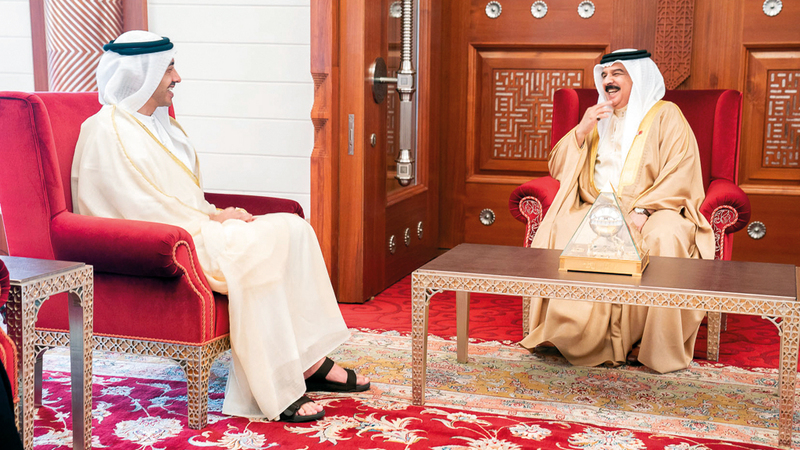 ملك البحرين خلال استقباله عبدالله بن زايد أمس. وام