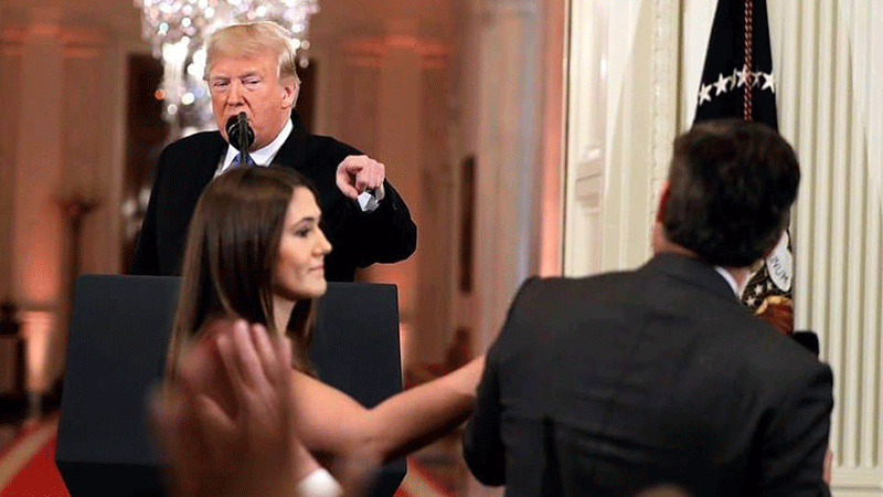 وحصل سجال حاد بين مراسل شبكة «سي أن أن» جيم أكوستا والرئيس الأميركي خلال المؤتمر الصحافي الذي عقده للتحدث عن نتيجة انتخابات منتصف الولاية، بعدما رفض الصحافي تسليم المذياع لامرأة من فريق البيت الأبيض إثر رفض ترامب الإجابة على سؤاله.