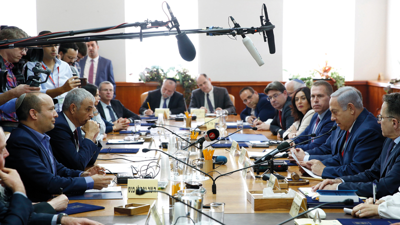 نتنياهو خلال ترؤسه الاجتماع الأسبوعي لمجلس الوزراء الذي حاول خلاله تبرير رفض تبكير الانتخابات. أ.ب